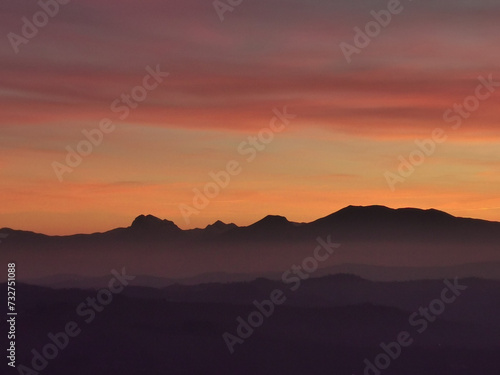 © GjGj, Obraz premium Il cielo rosso di nuvole sopra le montagne al tramonto
