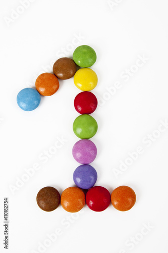 © claudio lanzi, Obraz premium Il numero 1 formato da coloratissimi confetti di cioccolata.