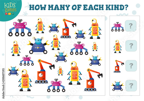 © kora_ra_123, Naklejka premium Ile każdego rodzaju kreskówka robot dzieci liczy ilustracji wektorowych gry