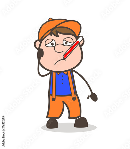 Obraz premium Ill Cartoon Worker with Fever Thermometer Vector