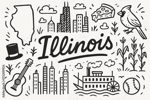 © Pointer Marker, Fototapeta premium Illinois doodle icon set. chicago landmarks, state symbols in line art style