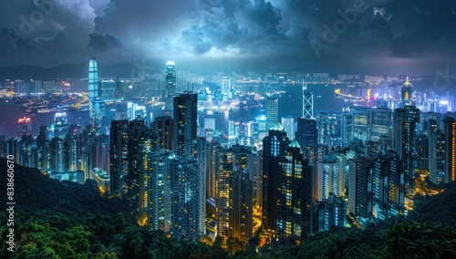 Fototapeta premium Illuminate a skyline dotted with towering skyscrapers and glittering city lights, representing urban prosperity and growth.