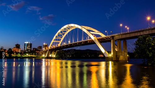 Naklejka premium Illuminated arch bridge at night over a river