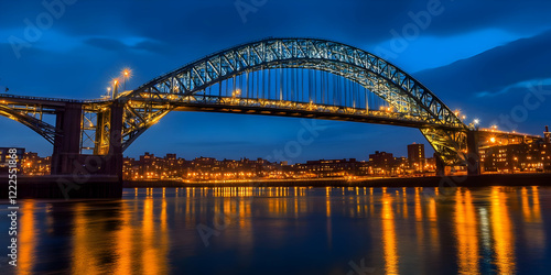 Naklejka premium Illuminated Arch Bridge Spans Tranquil River Reflecting City Lights at Twilight
