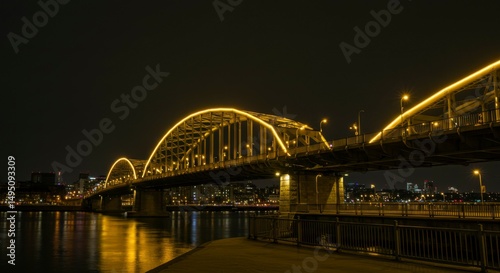 Obraz premium Illuminated arched bridge spanning a river at night, city lights reflecting...
