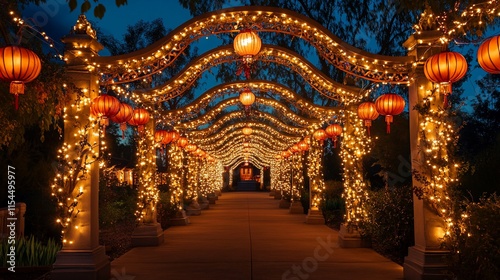Obraz premium Illuminated archway pathway at night with lanterns and string lights.