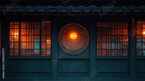 Fototapeta premium Illuminated Asian building exterior at night, featuring traditional windows and a circular light.