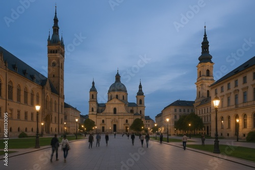 Fototapeta premium Illuminated Basilica in Europe at Dusk: Majestic Architecture and Urban Landscape Scenery