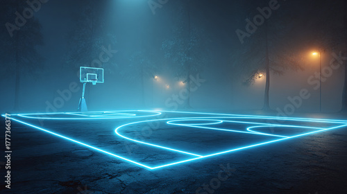 © Thiago, Fototapeta premium Illuminated basketball court in a misty night setting. The court is bathed in an eerie blue glow.