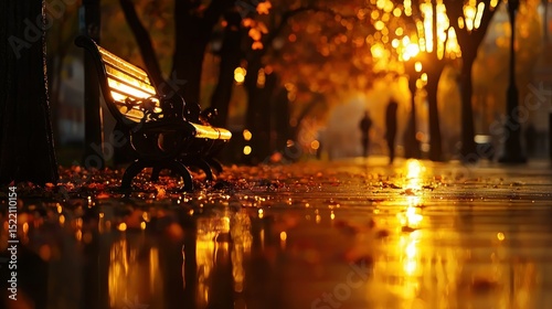 Obraz premium Illuminated bench reflects the golden glow of autumn evening light