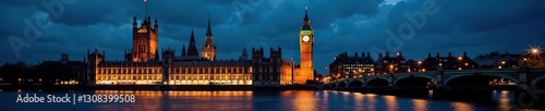 Naklejka premium Illuminated Big Ben & Westminster Palace at night, twilight, power, historic