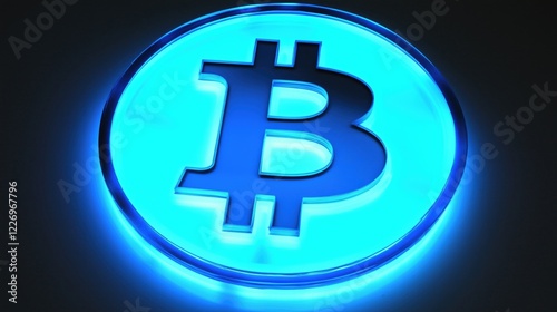 © LoLArt, Obraz premium Illuminated blue Bitcoin symbol in a circular design, representing cryptocurrency and digital finance in a modern context.