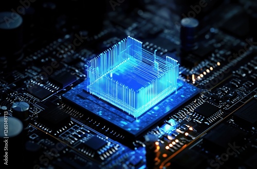 Fototapeta premium Illuminated Blue Processor Chip Glowing on Dark Circuit Board with High-Tech Aesthetic