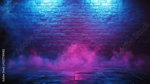 © 3dimensi2000, Obraz premium Illuminated Brick Wall with Mist and Neon Lighting Providing a Stage Effect