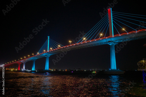 © Mohammed, Fototapeta premium Illuminated Bridge and Boats at Night