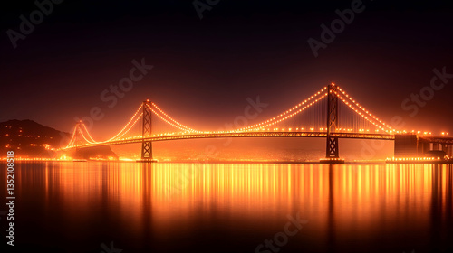 © RETNO, Obraz premium Illuminated bridge at night, city skyline reflected in calm water, nighttime cityscape background; ideal for travel or city brochures