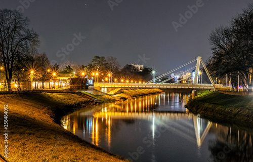 Fototapeta premium Illuminated bridge over the river, Nitra, Slovakia, night