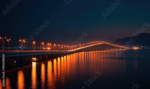 Fototapeta premium Illuminated bridge spans across dark water, reflecting warm lights under night sky