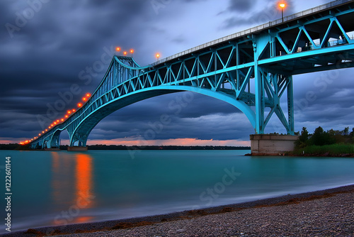 © Siasart, Fototapeta premium Illuminated Bridge Spans Calm Water Under Moody Sunset Sky, a Picturesque Scene.
