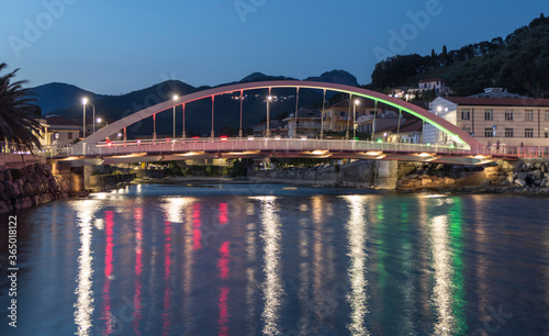 Obraz premium illuminated bridge with red, white and green lights in Sestri Levante