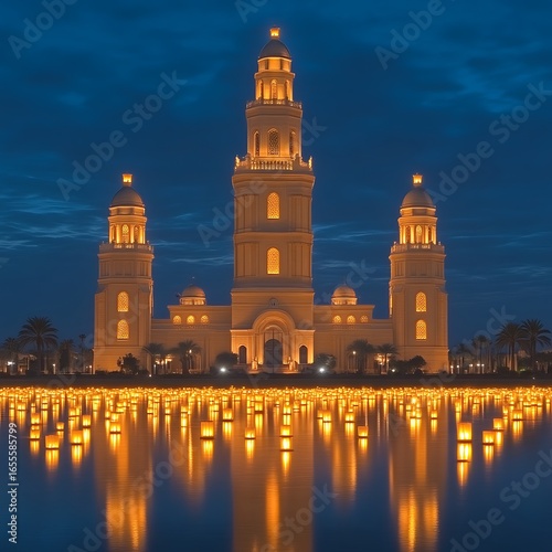 © Ruliana, Naklejka premium Illuminated building complex at twilight reflecting in water.