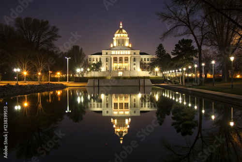 © Miraz, Fototapeta premium Illuminated building with reflections on water