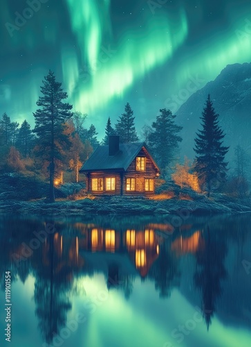 Fototapeta premium Illuminated Cabin Reflects in Still Lake Under Aurora Borealis