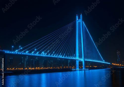 Fototapeta premium Illuminated cable-stayed bridge at night, a symphony of blue lights...