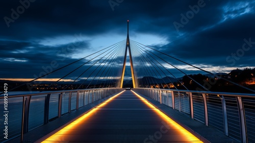 © musa, Obraz premium Illuminated cable-stayed bridge at twilight.