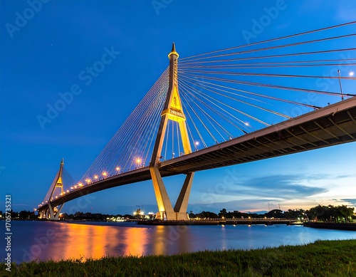 © karambol, Fototapeta premium Illuminated cable-stayed bridge at twilight over a calm river