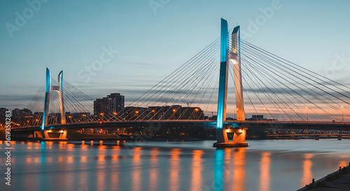 © rifan, Obraz premium Illuminated cable-stayed bridge reflecting in the water at dusk with a modern city skyline