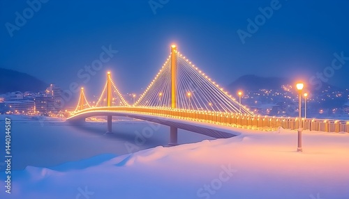 © halimatus, Fototapeta premium Illuminated cable-stayed bridge spans snowy waterfront at twilight
