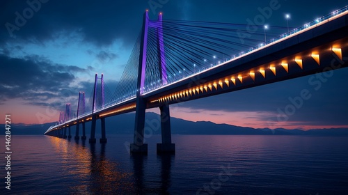 © Martinah, Fototapeta premium Illuminated cable-stayed bridge stretching across water during twilight hour