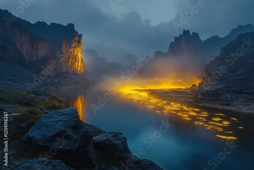© arri, Fototapeta premium Illuminated Canyon River Night Scene Dramatic Landscape