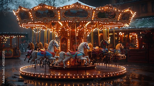 Fototapeta premium Illuminated carousel with horses at night, winter setting, wet ground.