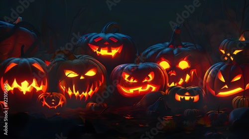 © Pascal, Naklejka premium illuminated carved pumpkins with different evil faces in darkness at Halloween night