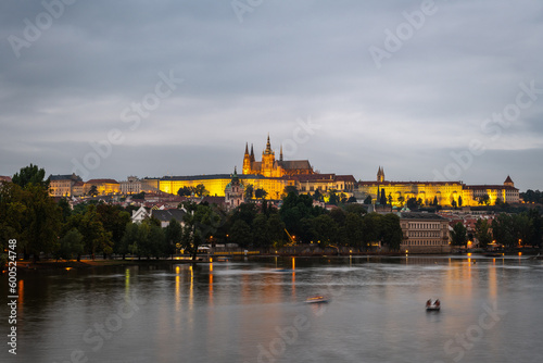 © Andrés García, Naklejka premium Illuminated Castle of Prague and Saint Vitus Cathedral as seen from the shore of the Vltava river at dusk. Long exposure.