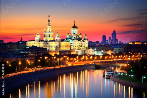 © Siasart Stock, Obraz premium Illuminated Cathedral and Cityscape Reflect in River at Sunset Beautifully