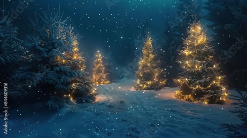 © Bijac, Obraz premium illuminated christmas tree forest with twinkling lights on snowy night festive holiday decorations