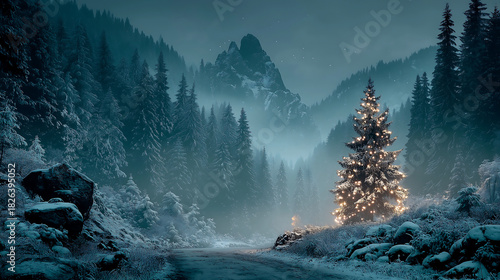 © Abstract World, Fototapeta premium Illuminated christmas tree in a snowy mountain landscape at night time scene