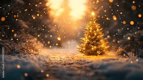 Obraz premium Illuminated Christmas tree on a snowy path with festive street lights, winter wonderland scene with falling snow, glowing bokeh, evening atmosphere, holiday decorations, warm golden lights.