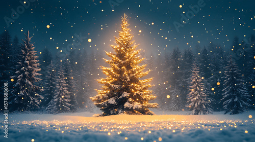 © Rasidah Rasidah, Naklejka premium Illuminated Christmas tree surrounded by snow-covered forest, with falling snowflakes creating a magical atmosphere