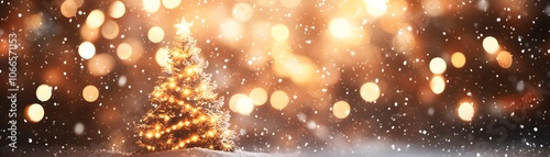 Naklejka premium Illuminated Christmas Tree with Falling Snow and Golden Bokeh Lights