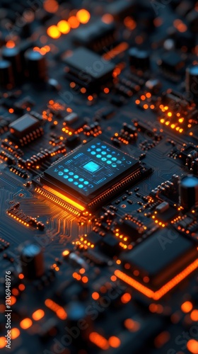 © Lemdah, Fototapeta premium Illuminated Circuit Board Chip Close-up