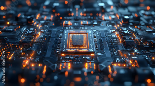 © jianjian, Obraz premium Illuminated Circuit Board Highlighting Technological Advancements