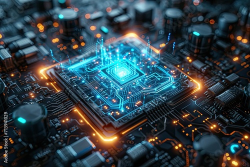 © Viktoriia, Obraz premium Illuminated Circuit Board with Central Processor
