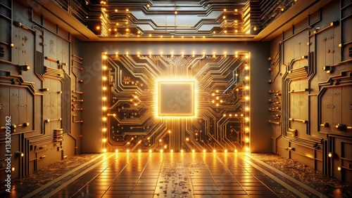 © Pluto, Obraz premium Illuminated Circuitry Chamber A Futuristic Golden Interior with Glowing Pathways and Central Processing Unit