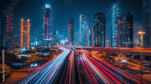 © embun, Fototapeta premium Illuminated City Buildings And Busy Freeway At Night