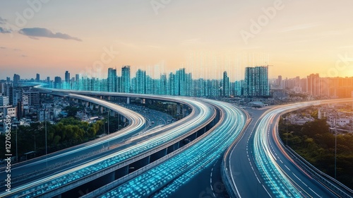 © Richafuji, Fototapeta premium Illuminated City Highway Network at Sunset