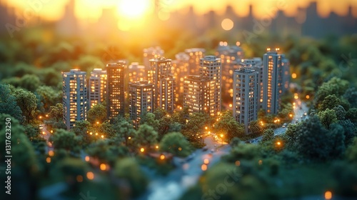 © Ali, Obraz premium Illuminated city nestled within lush green trees